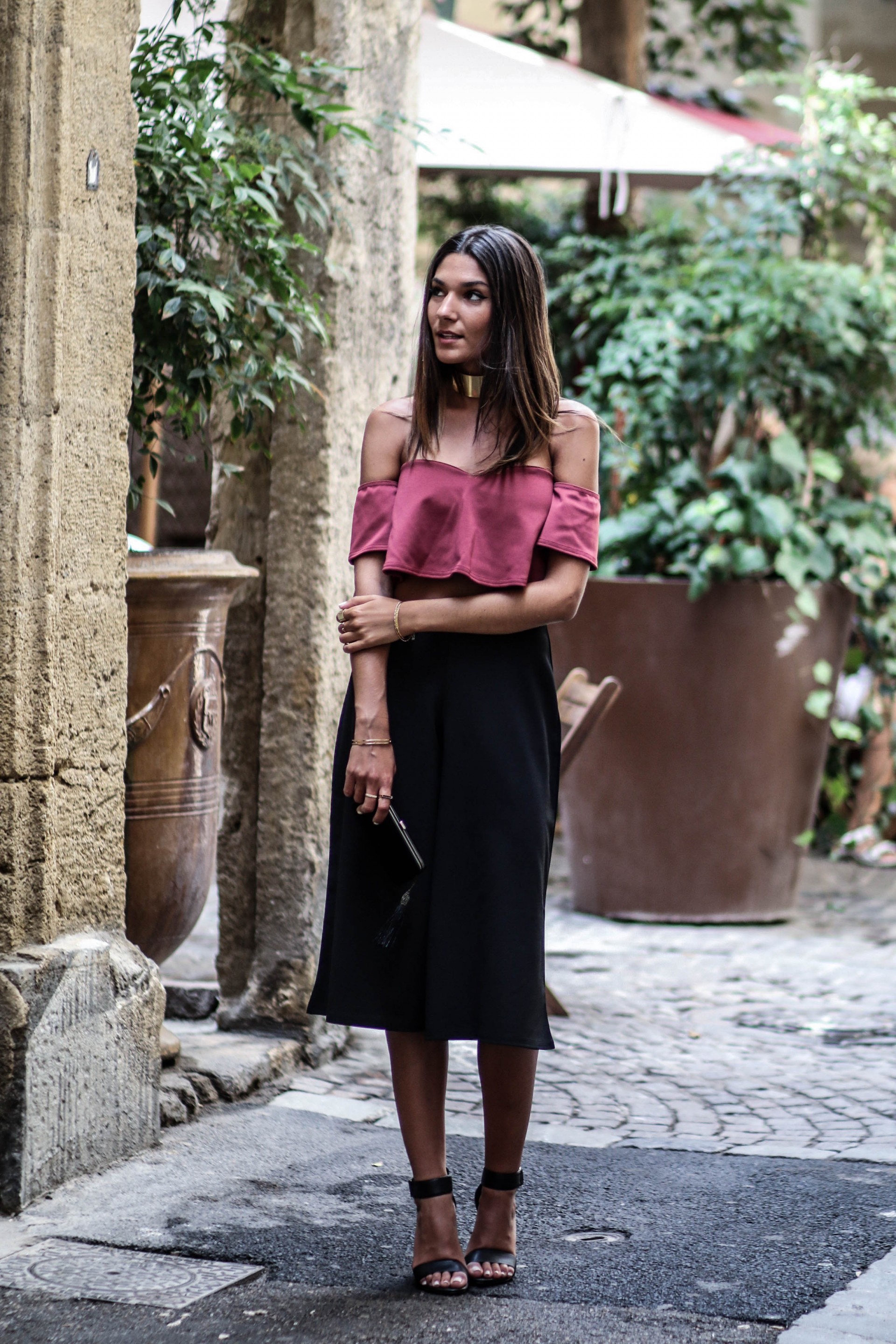 Pour le haut, j’ai craqué pour ce crop top à épaules dénudées couleur lie de vin. La couleur change un peu du traditionnel noir et blanc et sur une peau bronzée je trouve ça très joli!