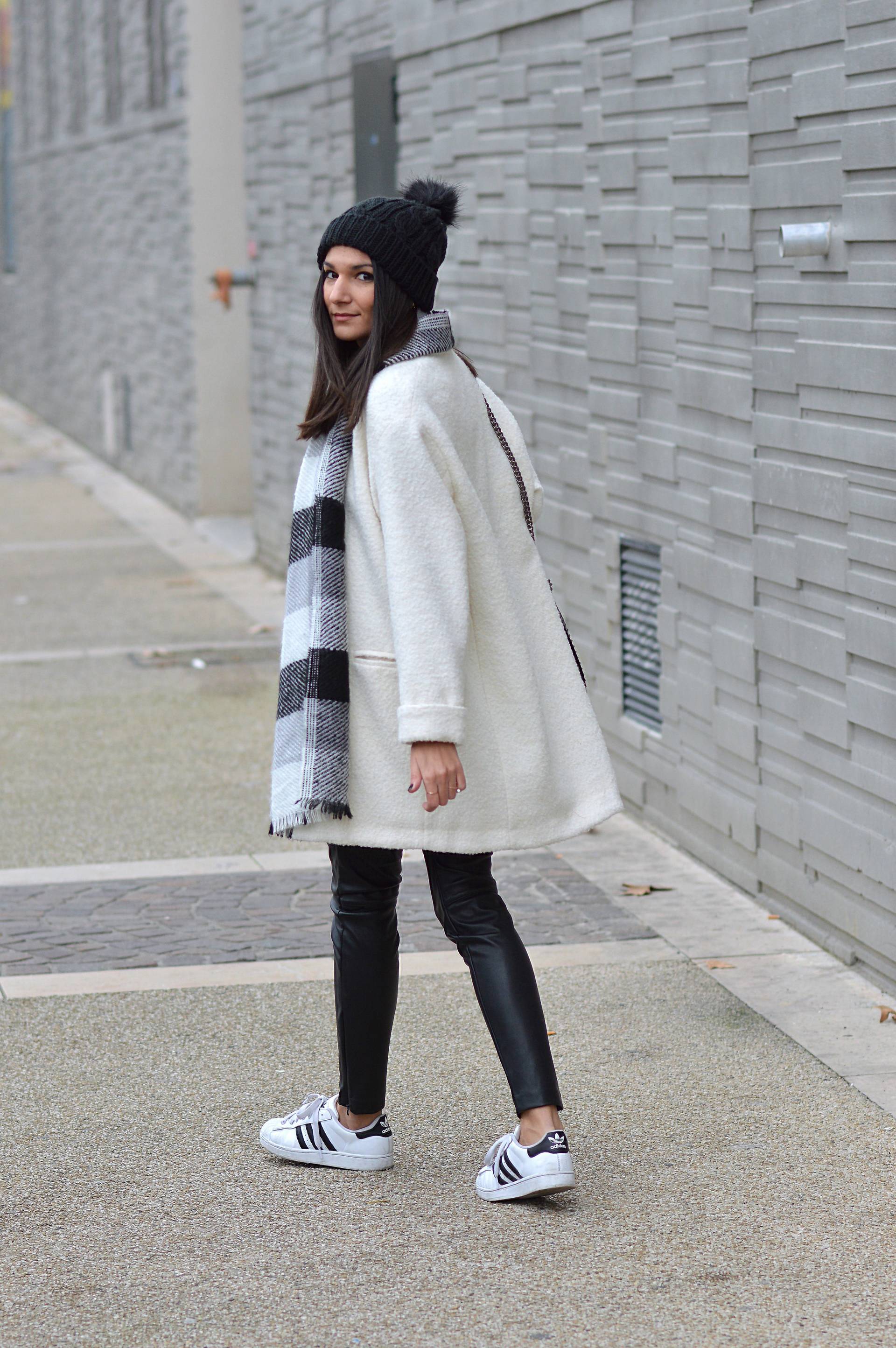 Ce manteau blanc est soldé, je l’avais eu en soldes privées donc pas de regrets pour moi mais c’est plutôt une bonne nouvelle pour vous! Le pantalon en similicuir est lui aussi en soldes et passe à -50%!!