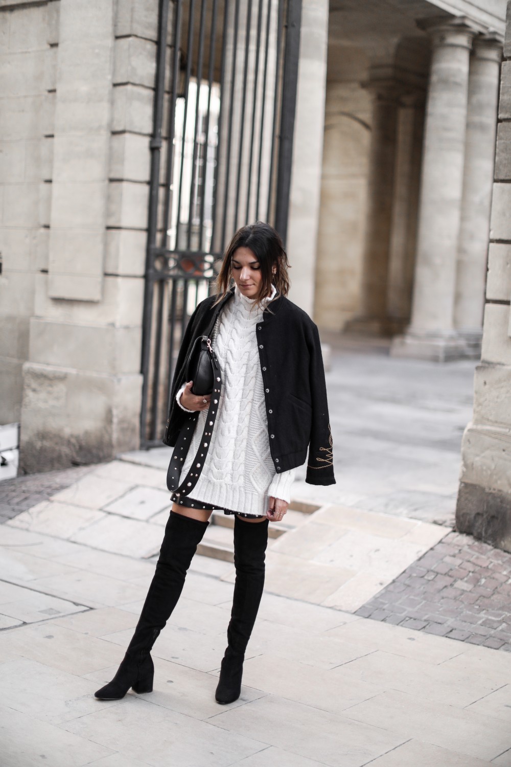 J’aimais beaucoup l’idée de la porter avec une jupe et des cuissardes, plutôt qu’un slim ou un jean comme on aurait tendance à le faire. La jupe est à peine visible d’ailleurs et c’est volontaire puisque je l’ai glissée sous une robe pull!