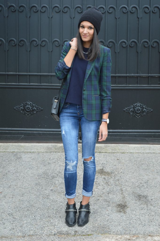 Il y a des pièces comme ce blazer imprimé tartan, que l’on est obligée de porter de façon décalée, sinon gare au fashion faux pas ! En l’occurrence, cet imprimé peut très vite avoir un effet mémérisant et nous faire tomber dans le classique. Voila pourquoi j’ai décidé de le porter en mode cool, avec un jean destroy et un bonnet en laine.